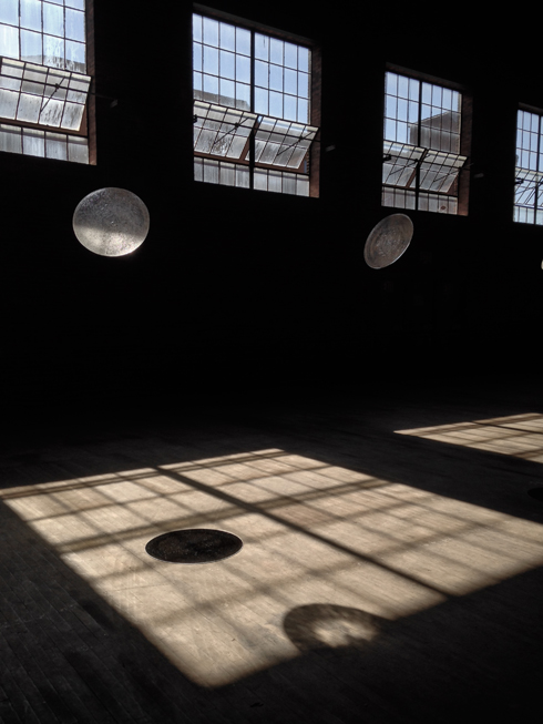 The seven rondels reference the days of the week. Suspended from the ceiling trellis and hanging 8 ft. above the ground, they are positioned in front of 7 windows on the west side of the Armory. The respective iris and grid shapes of the rondels and windows are projected onto the floor, arcing across the 25” mirrors as the sun light in the space changes throughout the day. For a short period of time, as light passes from the windows through the glass, the mirrors reflect and cast orbs of light on the ceiling.