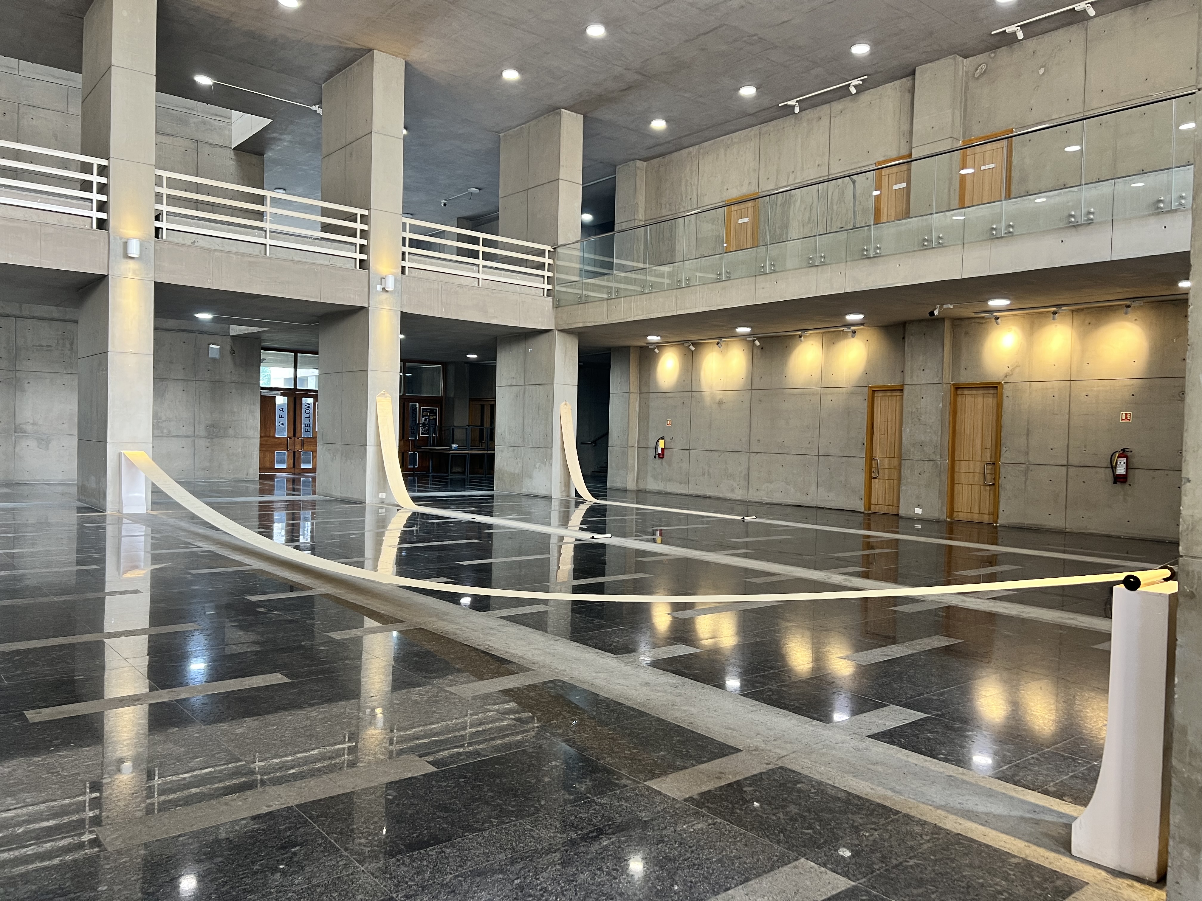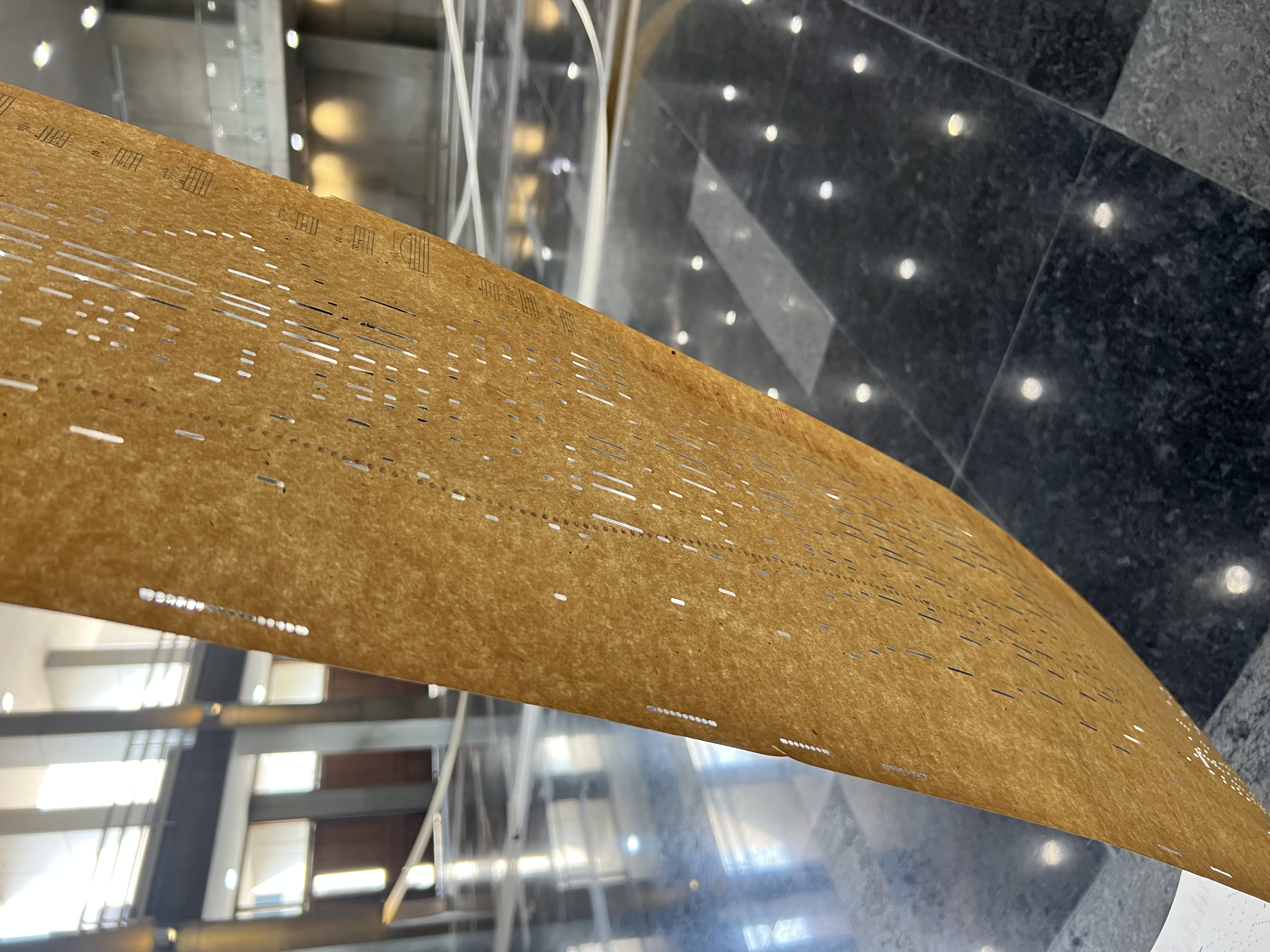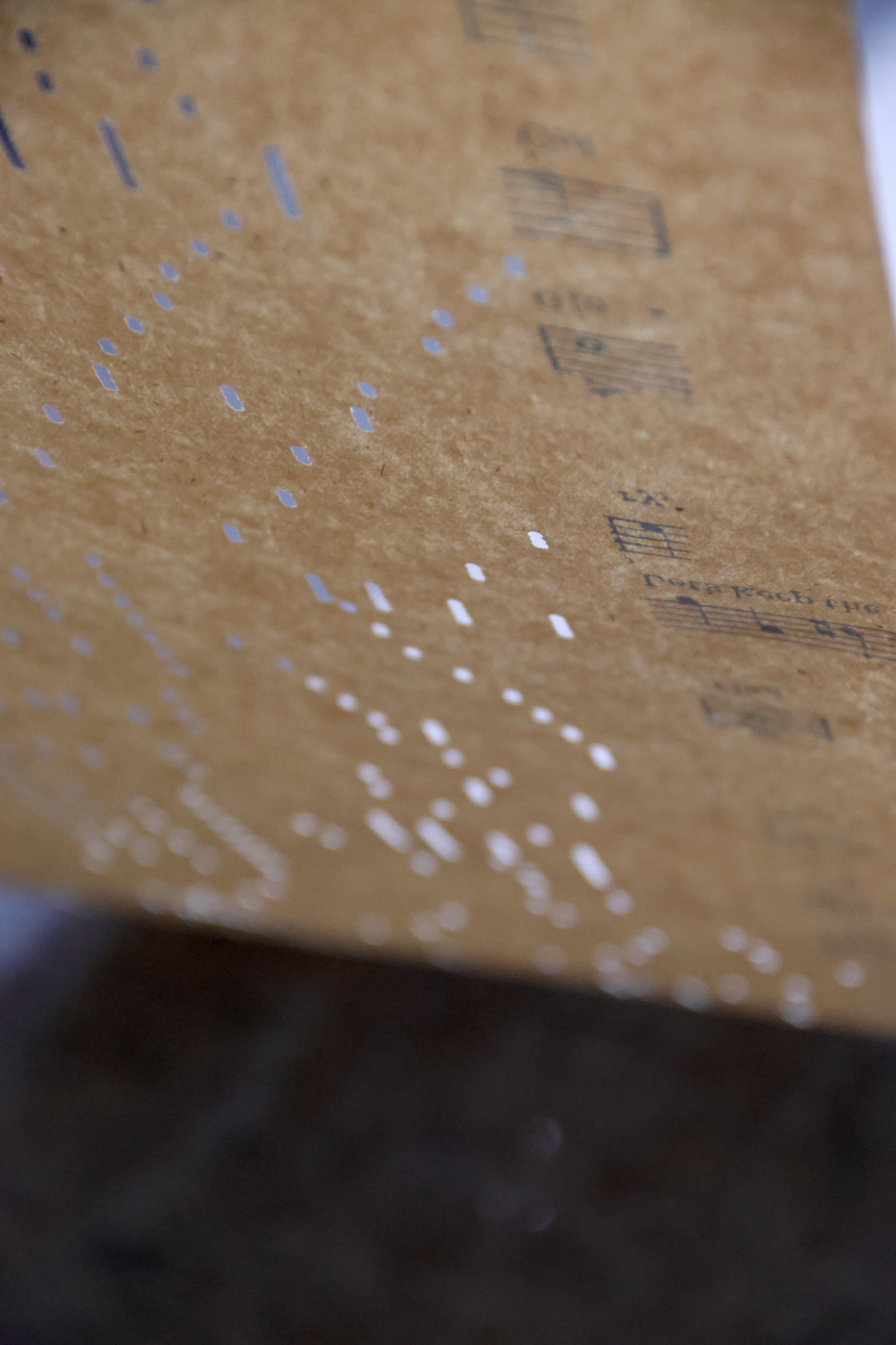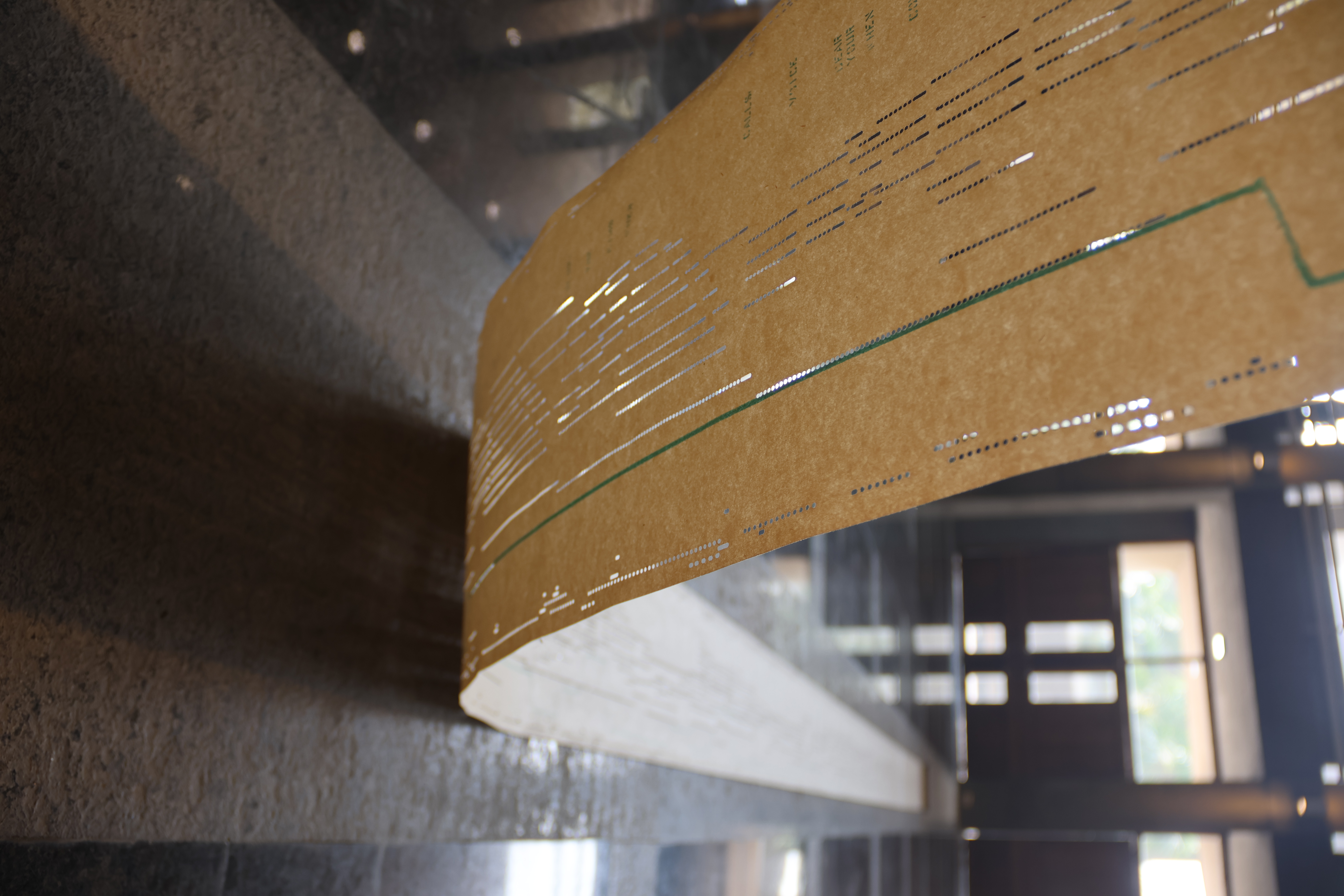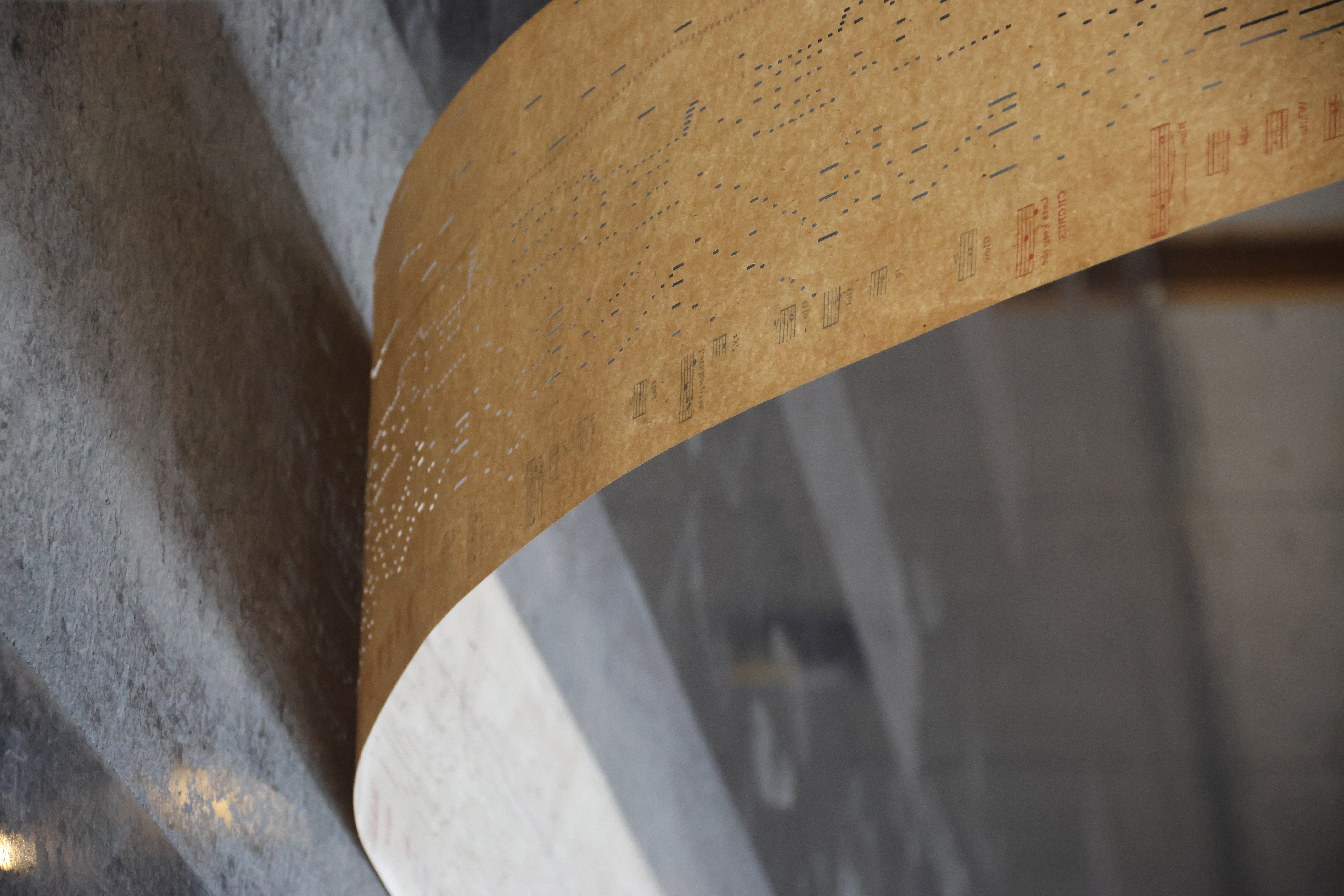 In her work, "Orchestrations" Yarrington weaves together vintage piano rolls andbook of musical scores with the light and space of an academic event hall in Shiv Nadar University. In this work, she conitinues to develop a focus on time as medium, giving form to invisible energies through material explorations.