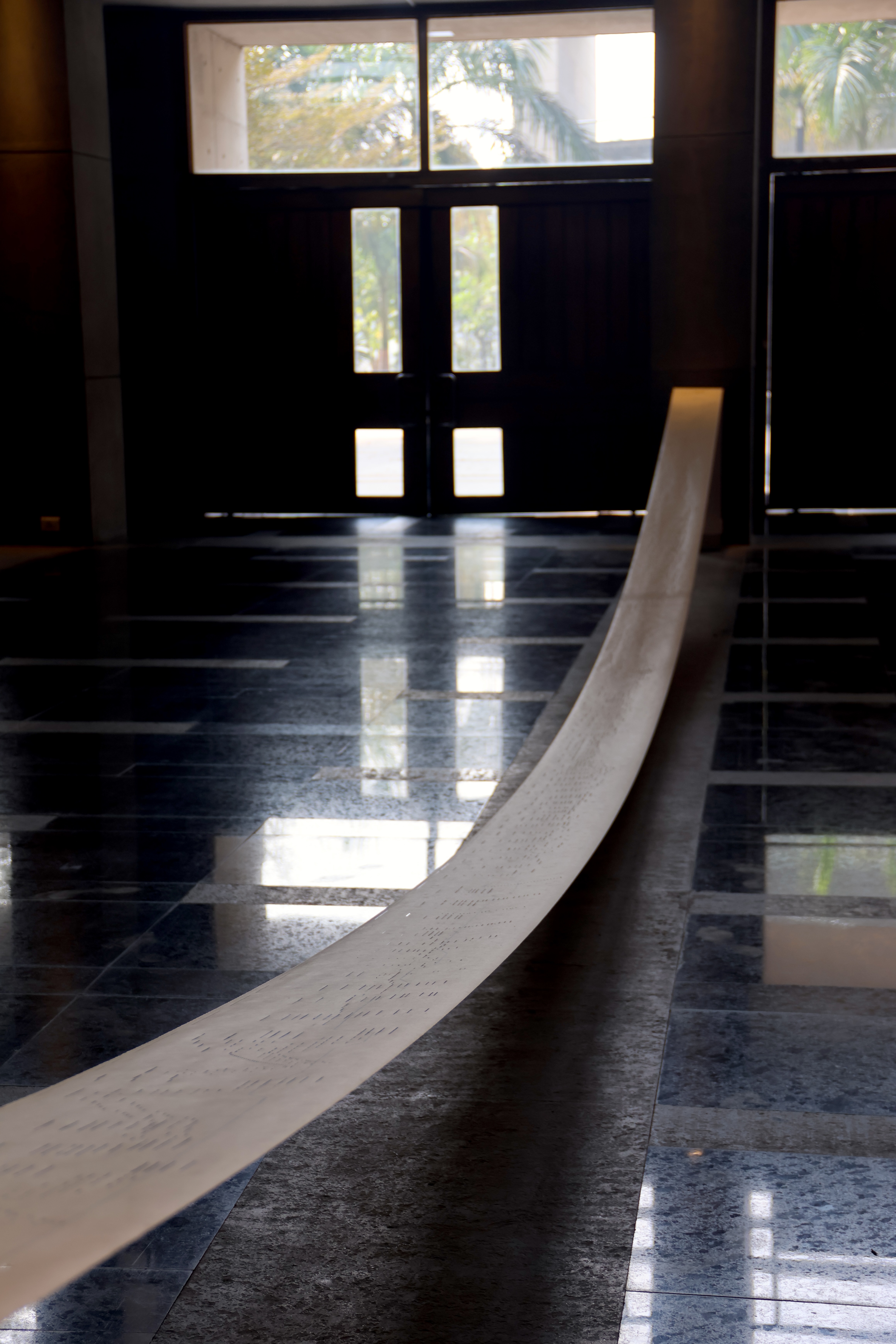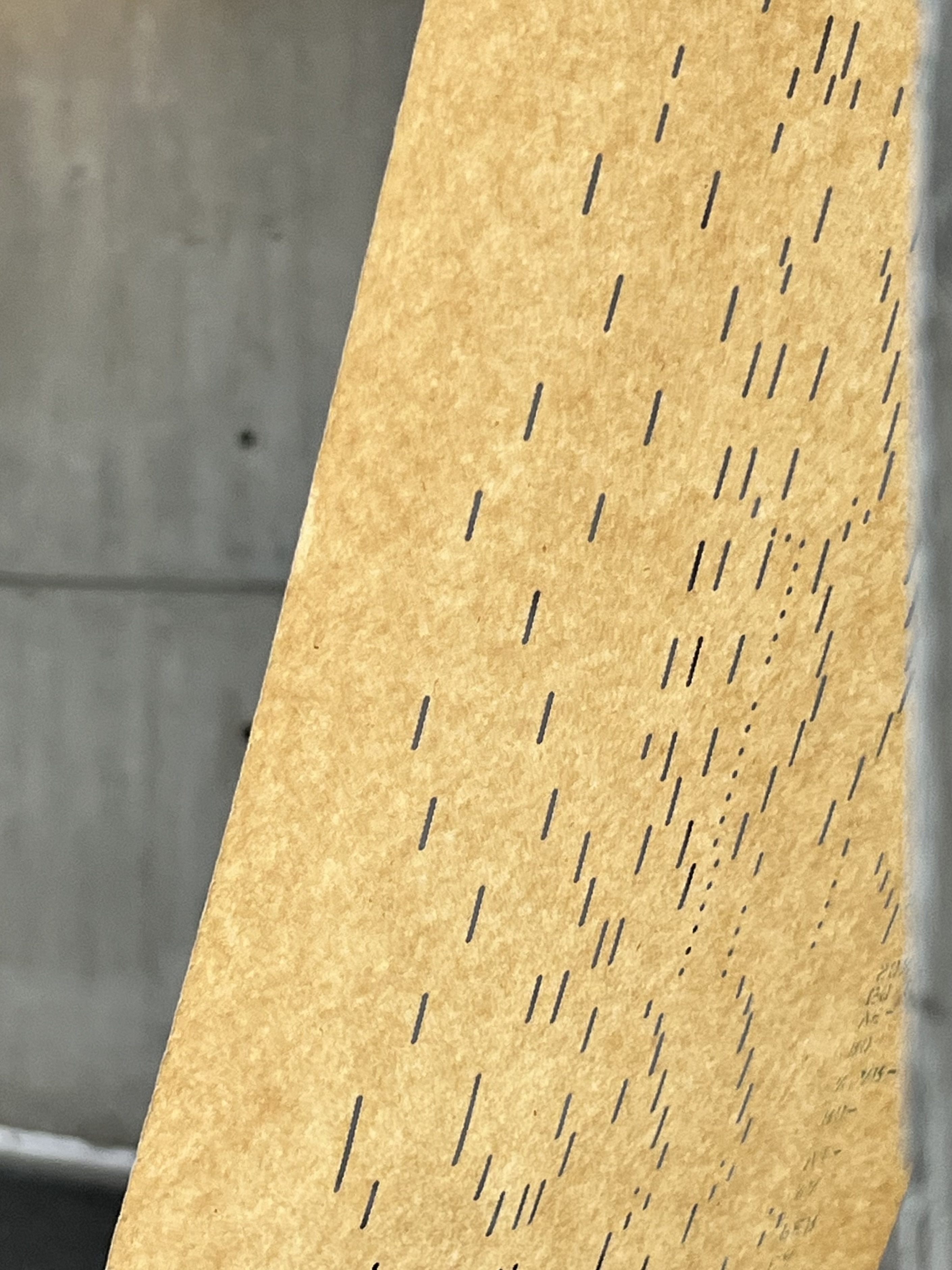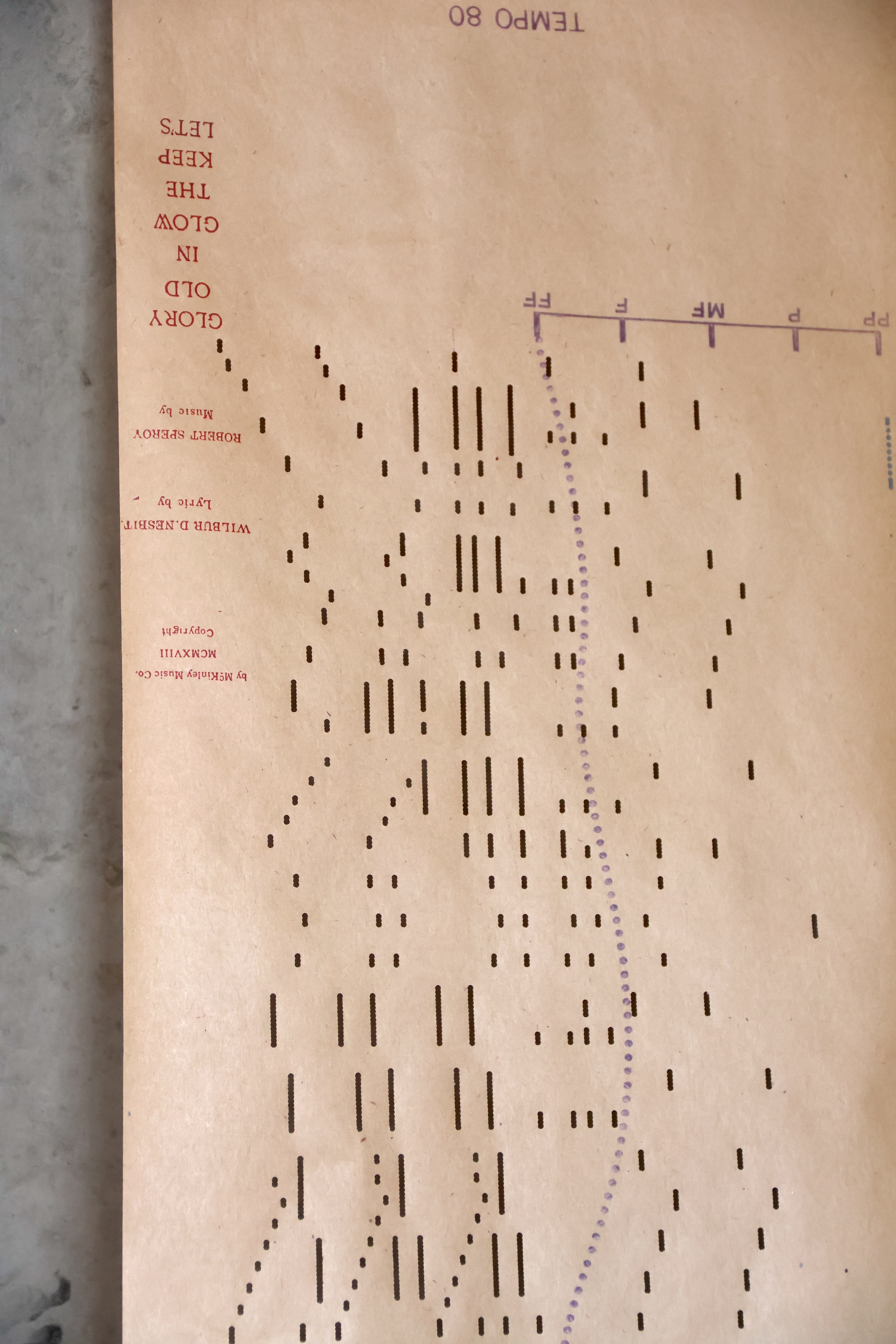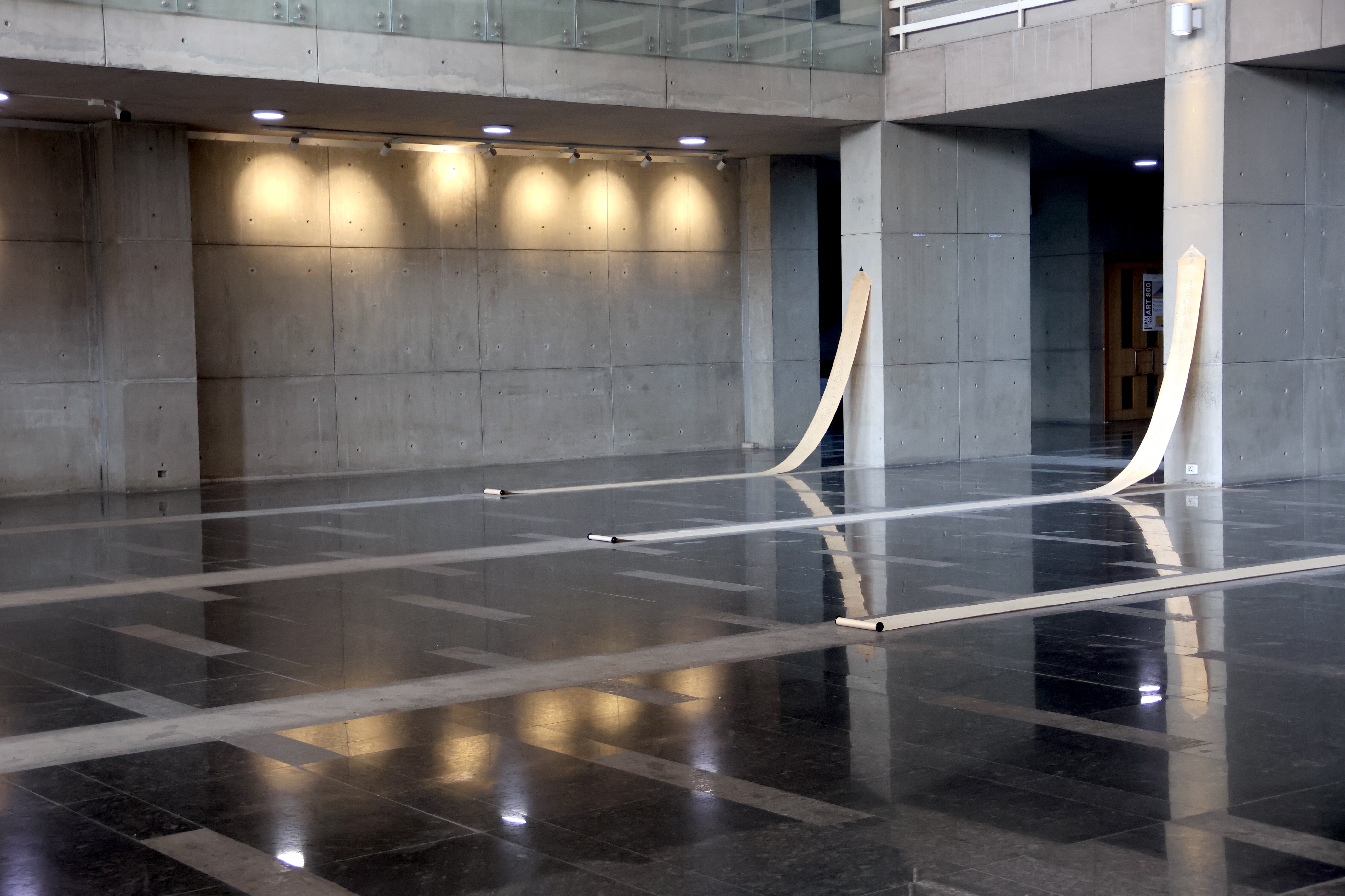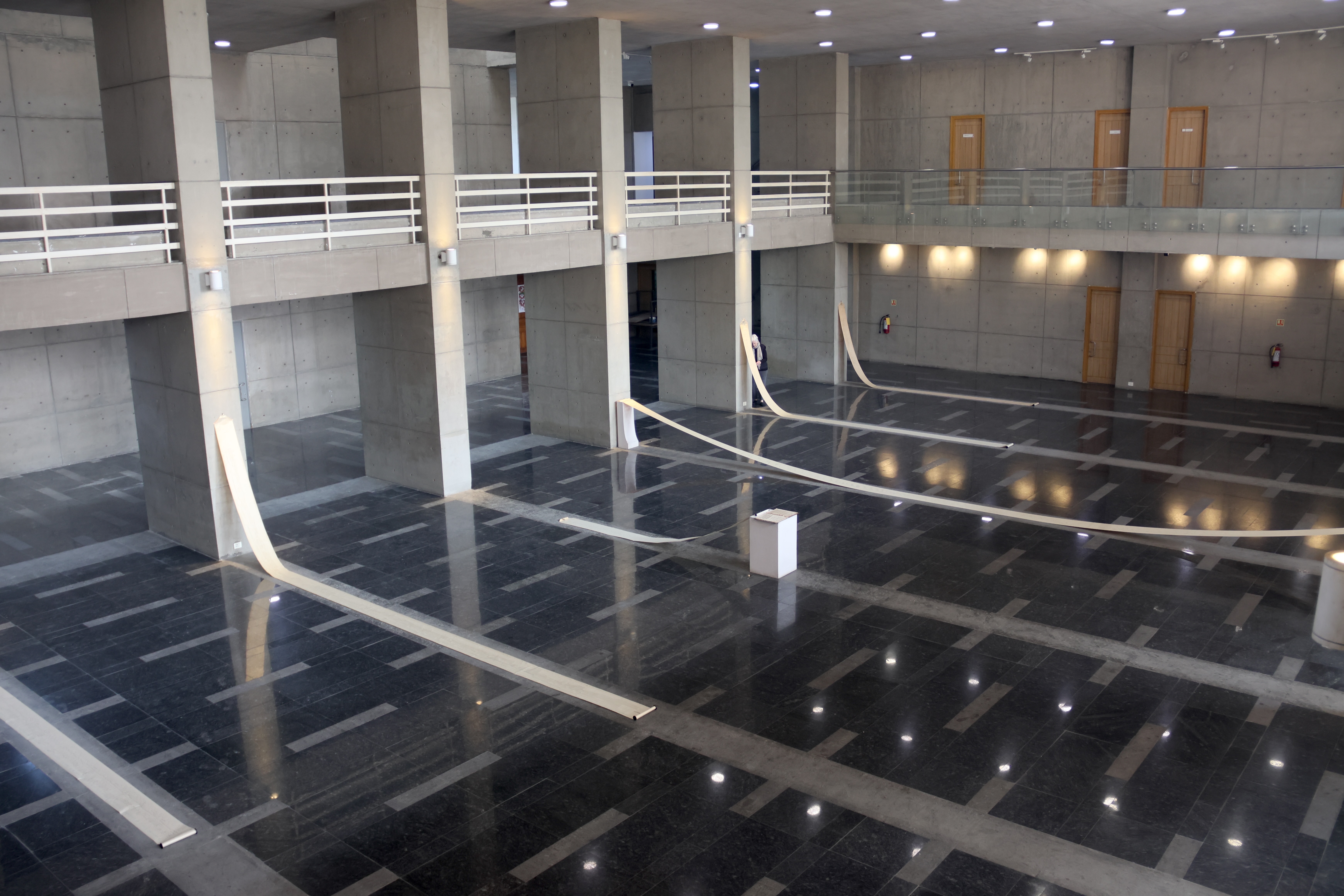In her work, "Orchestrations" Yarrington weaves together vintage piano rolls andbook of musical scores with the light and space of an academic event hall in Shiv Nadar University. In this work, she conitinues to develop a focus on time as medium, giving form to invisible energies through material explorations.