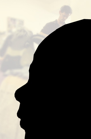 On the actual windows on the building behind the attached wall panel, and in back of the transparent photographs of the children, are translucent photographic images of the Warner Theatre costume designers at work. In this spatial interplay between the implied and actual windows, there are more aspects of the word "play", but now its adults at creative work on "plays". Behind these photographs of the designers, will be the actual designers whose movement back and forth, especially during the evening when preparing for an upcoming production, create another kind of kinetic shadow play.